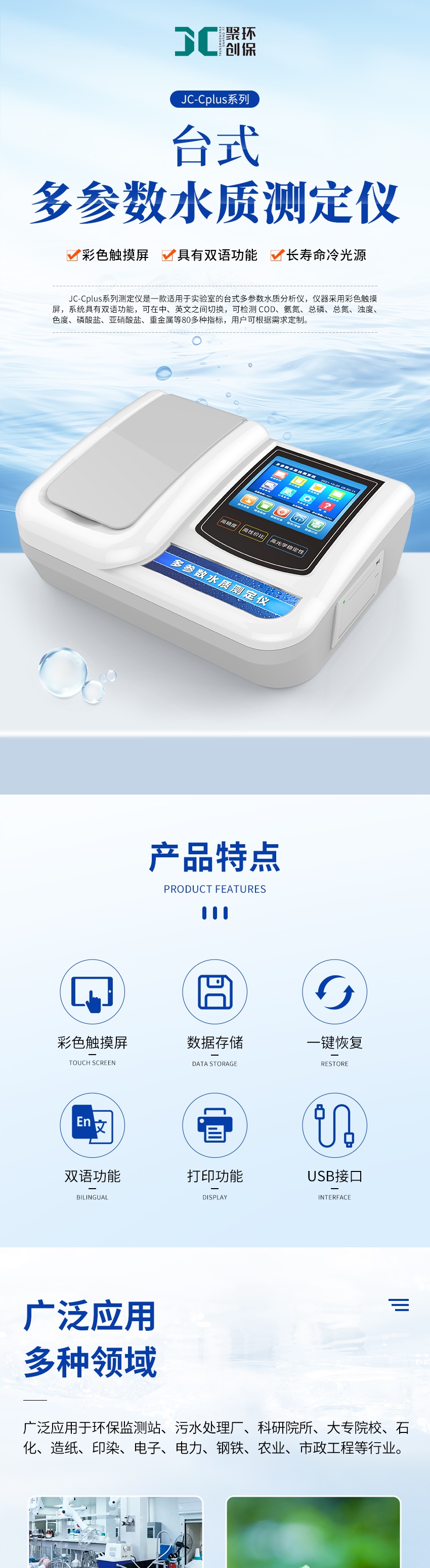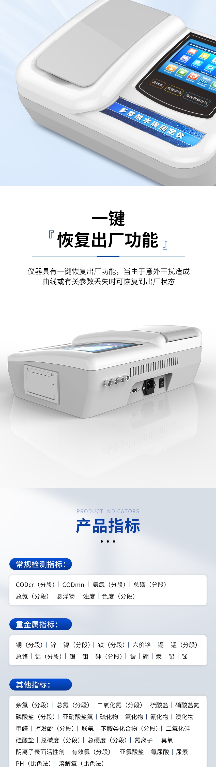 儀器可以根據用戶需要進行COD、氨氮、總磷、總氮、濁度、色度、懸浮物、重金屬及無機鹽(余氯、氨氮、亞硝酸鹽、溶解氧(電極法)、硫化物、磷酸鹽、鐵、六價鉻、錳、鹽度(筆式)、PH、溫度、電導、溶解氧))等參數自由的組合。廣泛適用于飲用水、地表水、污水的測定。