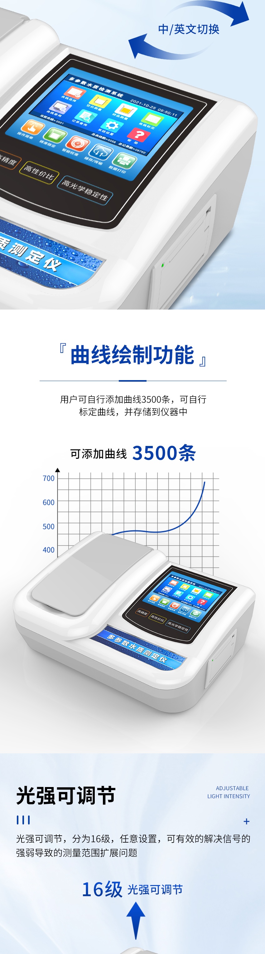 3、除了出廠曲線最多250條外,用戶可自行添加曲線3500條,可自行標定曲線,并存儲到儀器中;