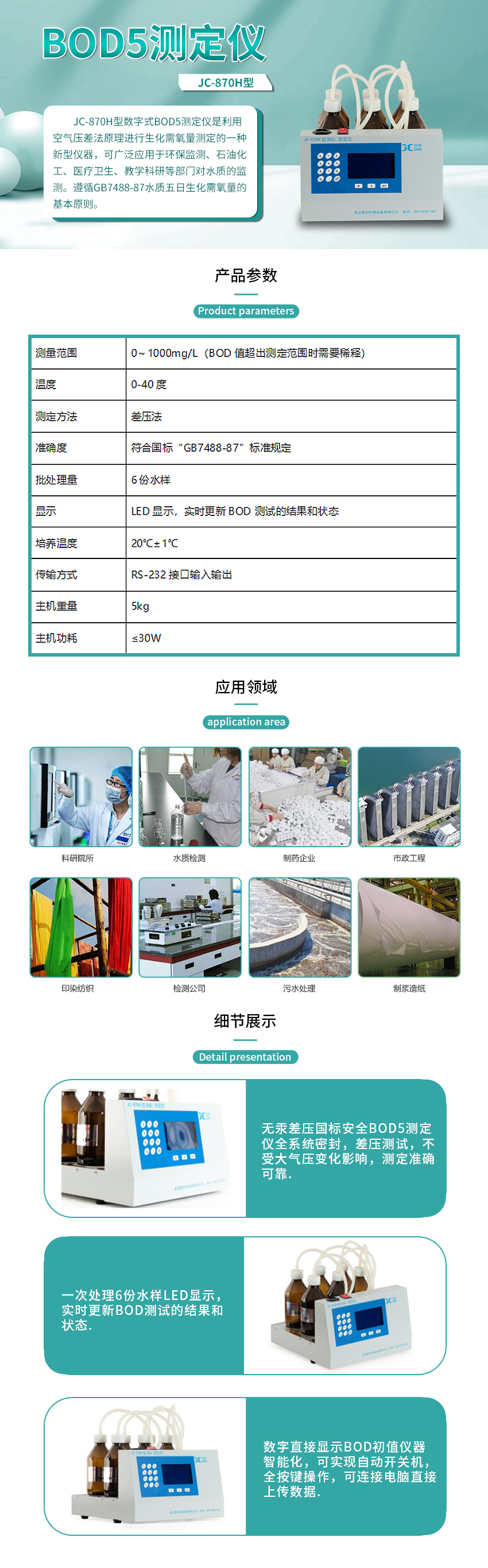 JC-870H型數字式BOD5測定儀是利用空氣壓差法原理進行生化需氧量測定的一種新型儀器,可廣泛應用于環保監測、石油化工、**衛生、教學科研等部門對水質的監測。該系列產品遵循GB7488-87水質五日生化需氧量的基本原則。五日培養法也稱標準稀釋法或稀釋接種法。原理是:水樣經稀釋后,在20℃±1℃條件下培養5天,求出培養前后水樣中溶解氧含量,二者的差值為BOD5。生化需氧量或生化耗氧量(一般指五日化學需氧量),表示水中有機物等需氧污染物質含量的一個綜合指標。說明水中有機物由于生化作用進行氧化分解,使之無機化或氣體化時所消耗水中溶解氧的總數量。其值越高說明水中有機污染物質越多,污染也就越嚴重。