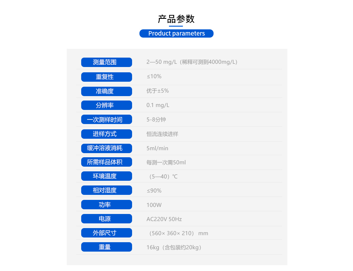 測(cè)量范圍 2—50 mg/L(稀釋可測(cè)到4000mg/L)