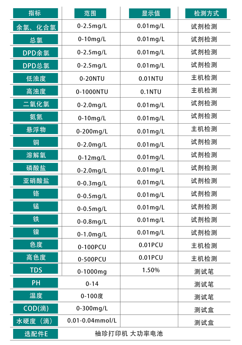 青島聚創多參數檢測儀是根據不同的使用單位設置的不同的儀器。多參數檢測儀可以檢測水中的多項參數,*多可以有65項的參數:余氯、總氯、次氯酸鈉、二氧化氯、氯化物、氯化氰、氯化物(滴)、氰化物、過氧乙酸、硝酸鹽、硝酸鹽氮、亞硝酸鹽、亞硝酸鹽氮、溫度、色度、濁度(A)、濁度(B)、亞氯酸鹽、氨氮、氟化物、溶解氧、總磷、磷酸鹽、正磷酸鹽、甲醛、臭氧、三價鉻、六價鉻、鉻酸鈉、硫酸鹽、硫化物、硫化氫、化學耗氧量(COD)、CODmn(滴)、總堿度(滴)、總硬度、總硬度(滴)、二氧化硅、礦化度、碳酸鹽·重碳酸鹽(滴)、揮發酚、清潔劑、碘、酸度(酚酞)滴、P H、過氧化氫、P H值、鹽度、聯氨、鉬、錳、鋁、銅、鐵、鋅、鈷、銀、鉀、鈣、鎂、鎳、鈉、砷、鋇、鈹。