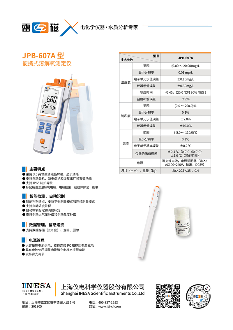 (4)JPB-607A:探頭測定,自動溫補,可以顯示溶解氧和溫度
