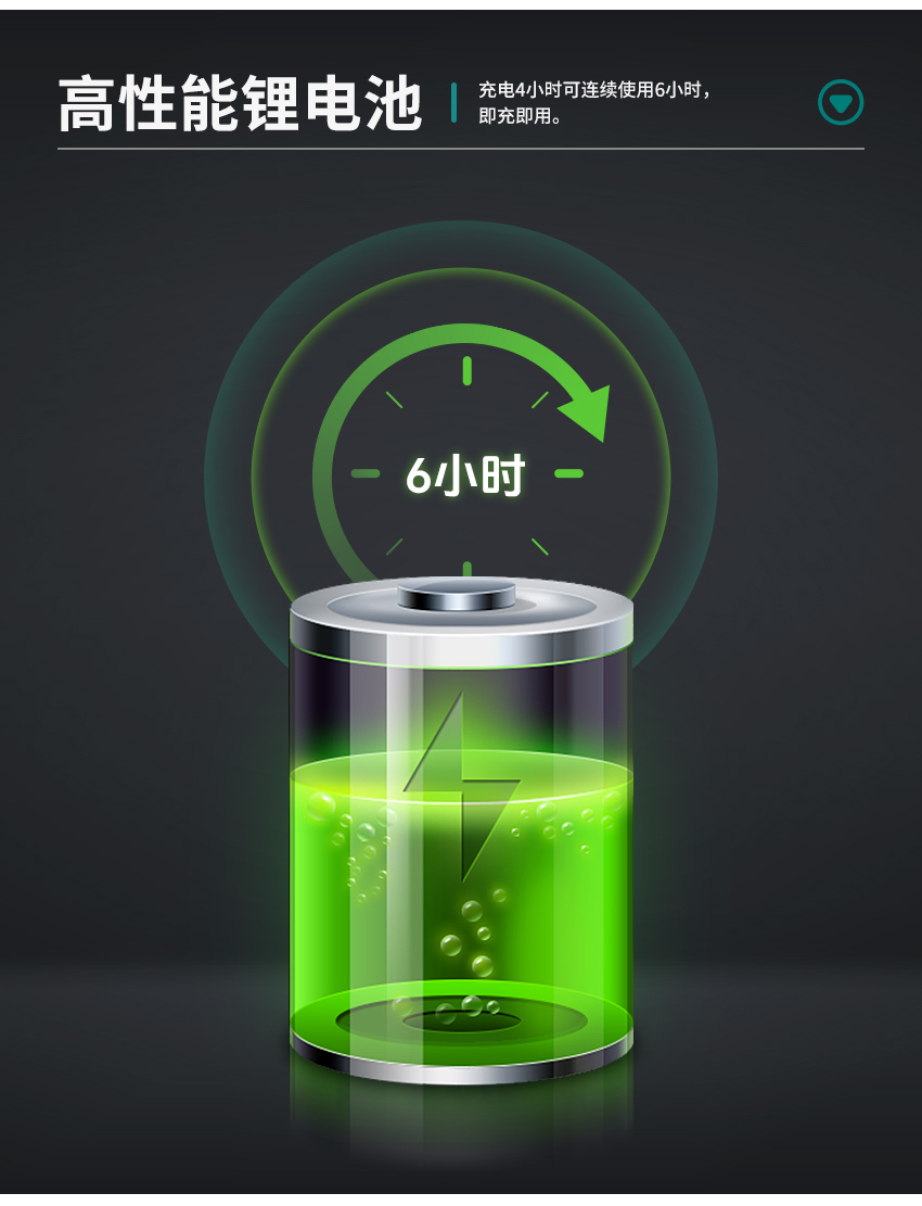 • 1.高性能鋰電池,充電4小時可連續使用6小時,即充即用。