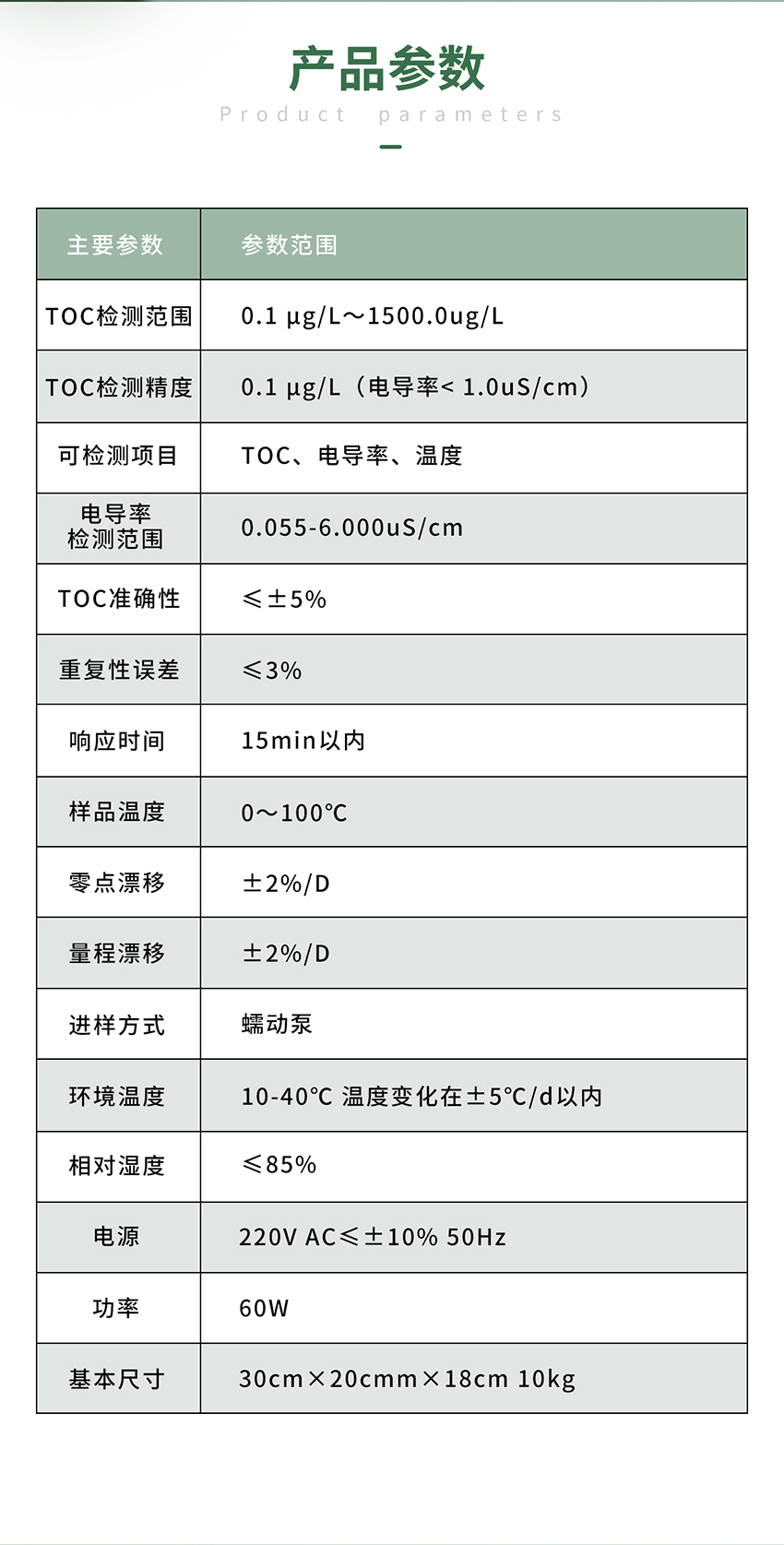 TOC檢測精度 0.1 μg/L(電導率< 1.0uS/cm)
