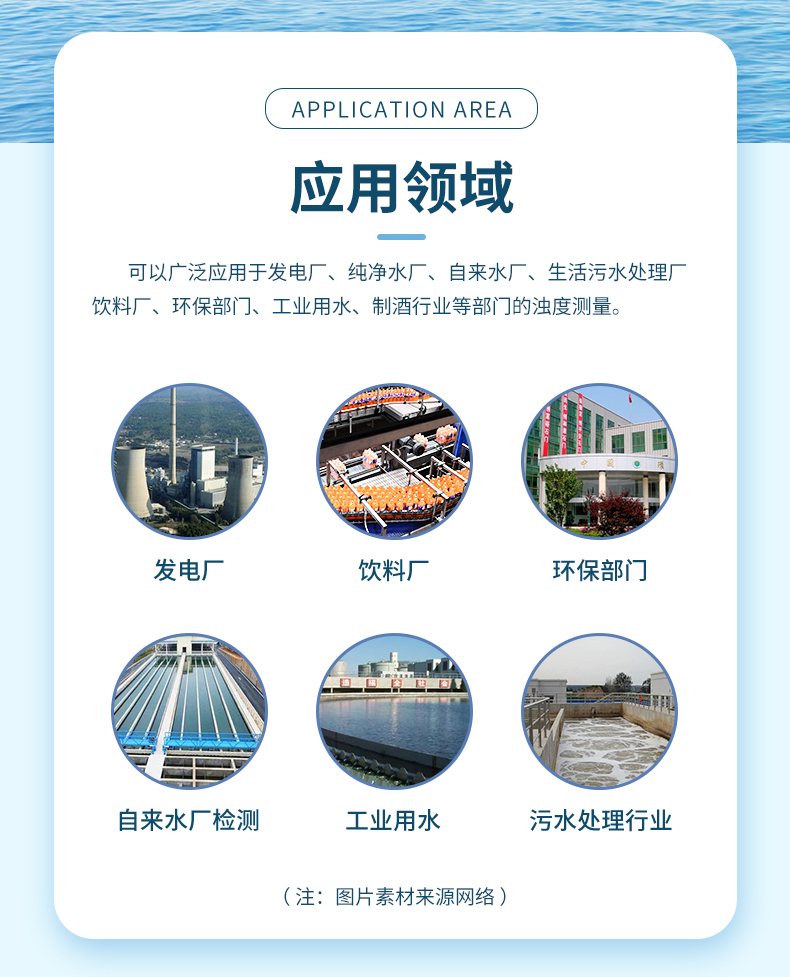 廣泛應用于發電廠、純凈水廠、自來水廠、生活污水處理廠、飲料廠、環保部門、工業用水、制酒行業等部門的濁度測量。