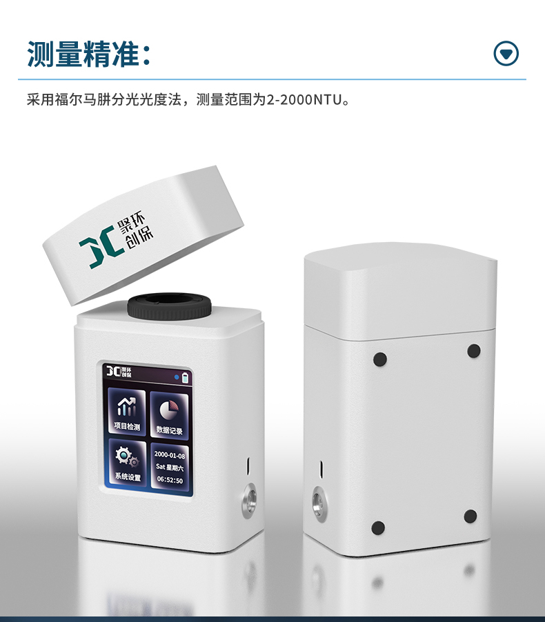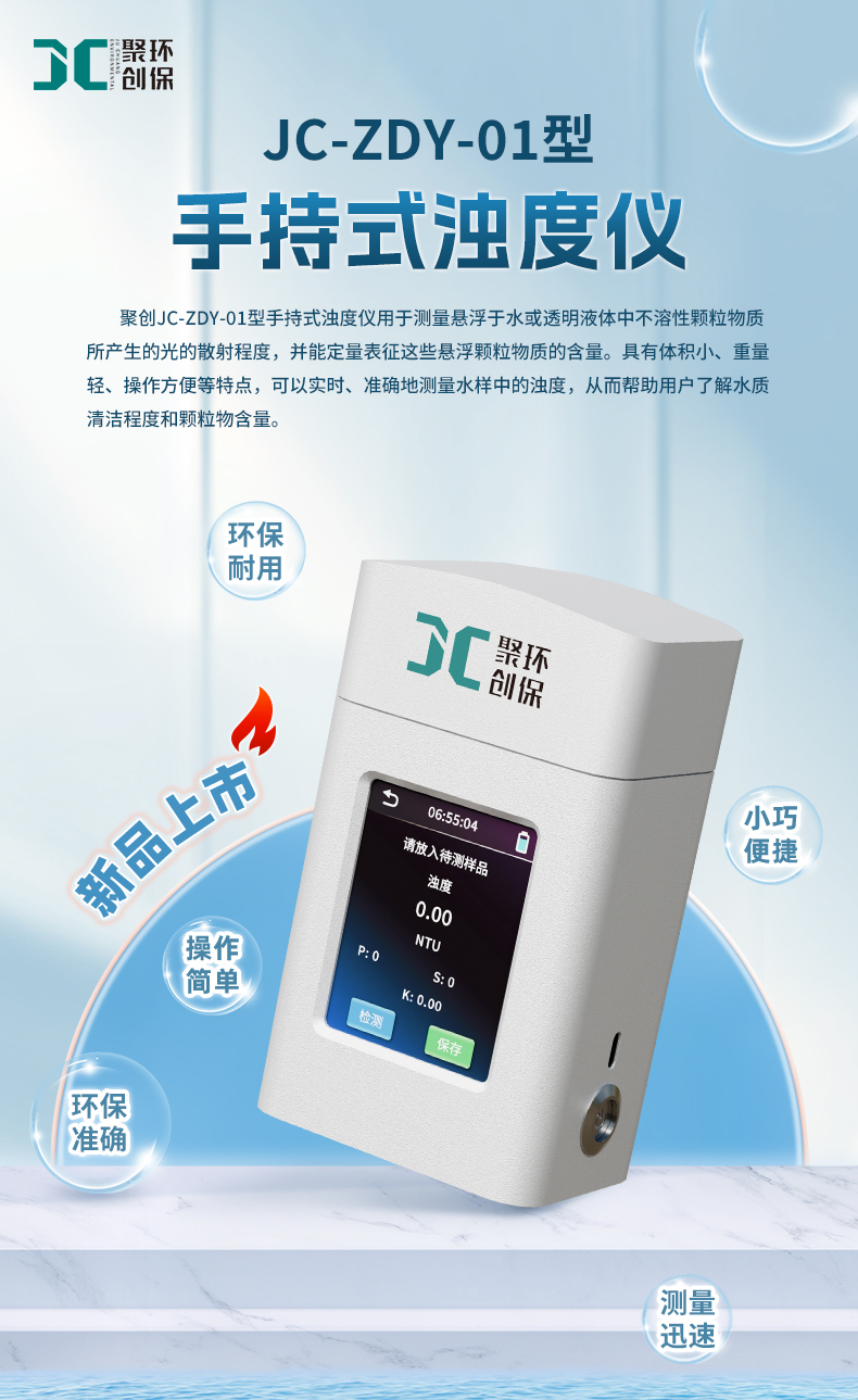 聚創JC-ZDY-01型手持式濁度儀具有體積小、重量輕、操作方便等特點,可以實時、準確地測量水樣中的濁度,從而幫助用戶了解水質清潔程度和顆粒物含量。該產品通常采用光學透-散射原理進行測量,并配備簡潔的操作界面和便攜式外觀,便于用戶隨時隨地進行濁度測試。