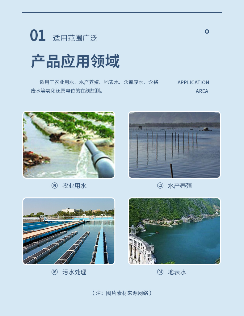 適用于農(nóng)業(yè)用水、水產(chǎn)養(yǎng)殖、地表水、含氰廢水、含鉻廢水等氧化還原電位的在線監(jiān)測。
