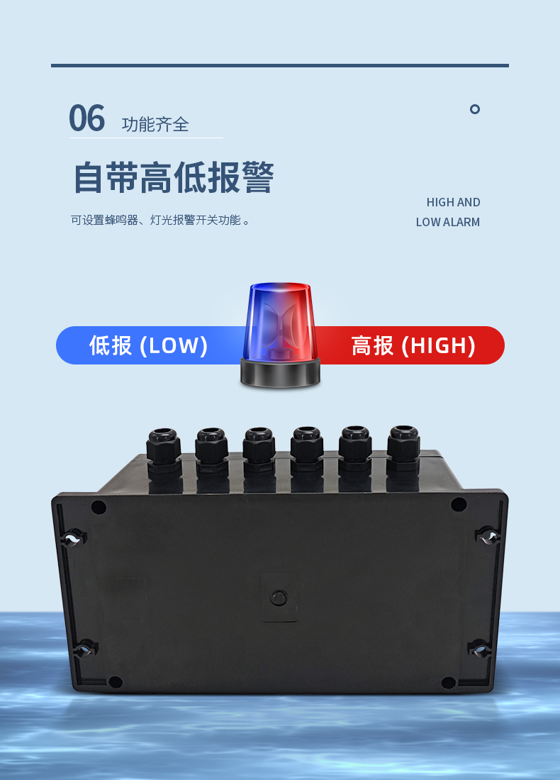 八組ON/OFF繼電器接點(diǎn) 分為高點(diǎn)、低點(diǎn)報(bào)警輸出,繼電器滯后量任意設(shè)定,繼電器最大負(fù)載30VDC/5A |