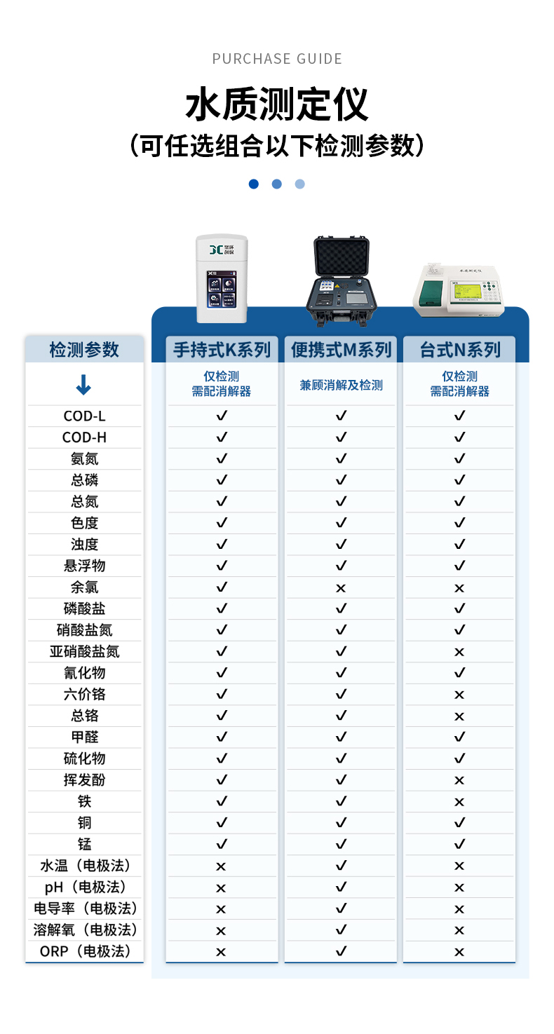 1、聚創K系列、M系列及N系列水質測定儀都可以用于檢測COD、氨氮、總磷、總氮,也可根據用戶需求定制添加色度、懸浮物等更多參數,詳情可咨詢客服