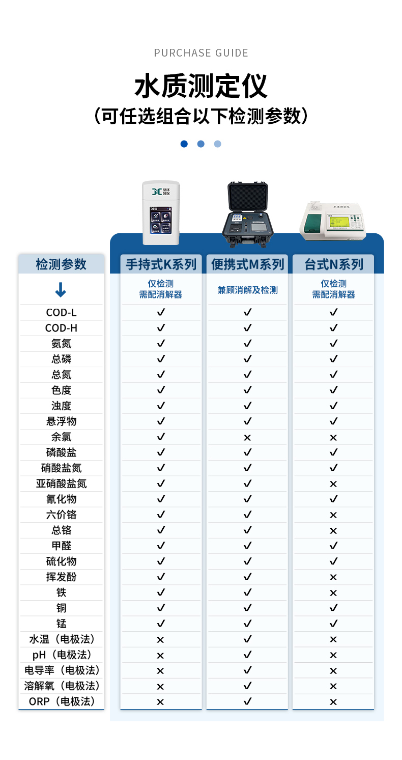 1、聚創K系列、M系列及N系列水質測定儀都可以用于檢測COD、氨氮、總磷、總氮,也可根據用戶需求定制添加色度、懸浮物等更多參數,詳情可咨詢客服。