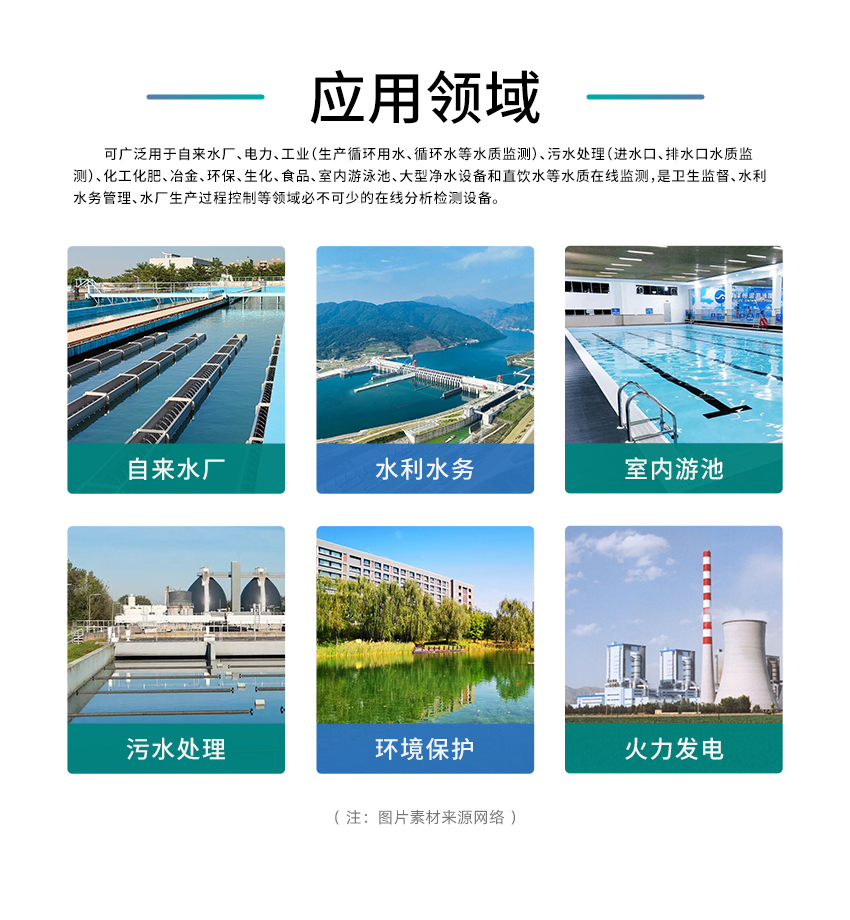 可廣泛用于自來水廠、電力、工業(生產循環用水、循環水等水質監測)、污水處理(進水口、排水口水質監測)、化工化肥、冶金、環保、生化、食品室內游泳池、大型凈水設備和直飲水等水質在線監測,是衛生監督、水利水務管理、水廠生產過程控制等領域必不可少的在線分析檢測設備。