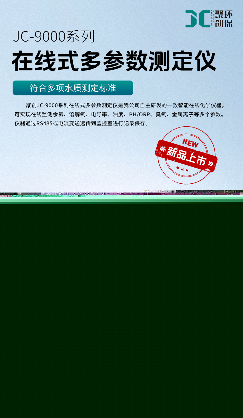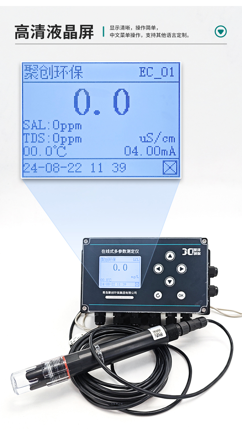 聚創在線式多參數測定儀(JC-9000系列)是我公司自主研發的一款智能在線化學儀器,可實現在線監測余氯、溶解氧、電導率、濁度、PH/ORP、臭氧、金屬離子等多個參數。儀器通過RS485或電流變送遠傳到監控室進行記錄保存。