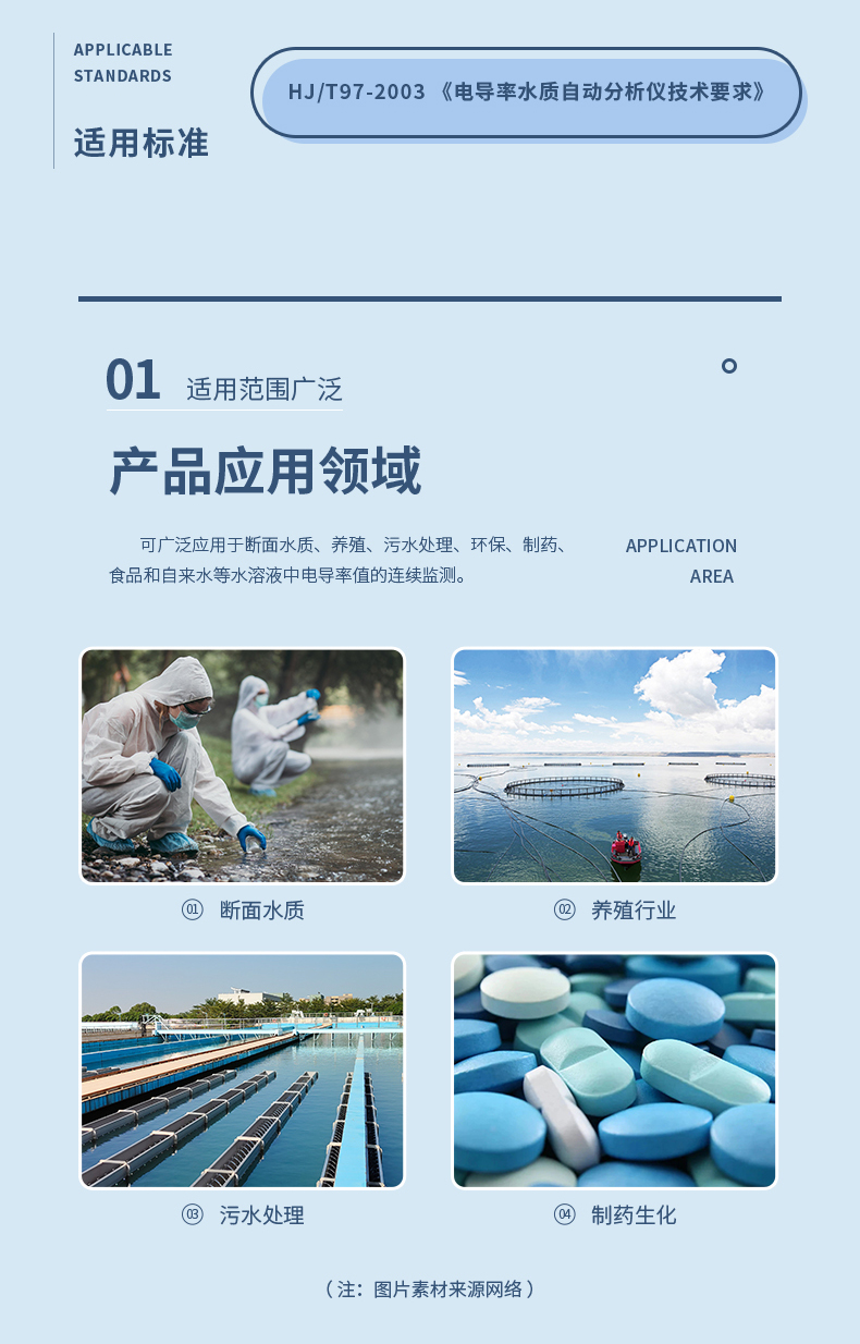 可廣泛應用于斷面水質、養殖、污水處理、環保、制藥、食品和自來水等水溶液中電導率值的連續監測。