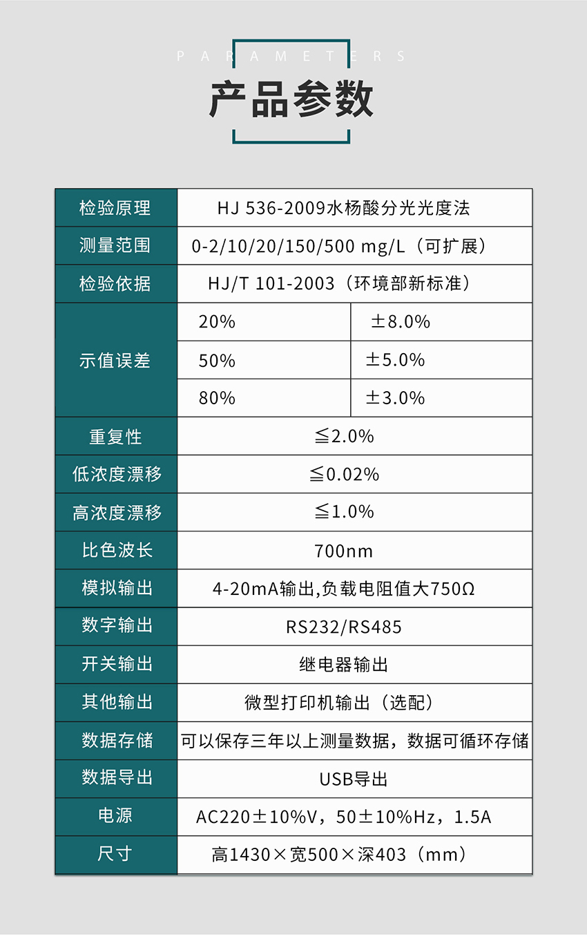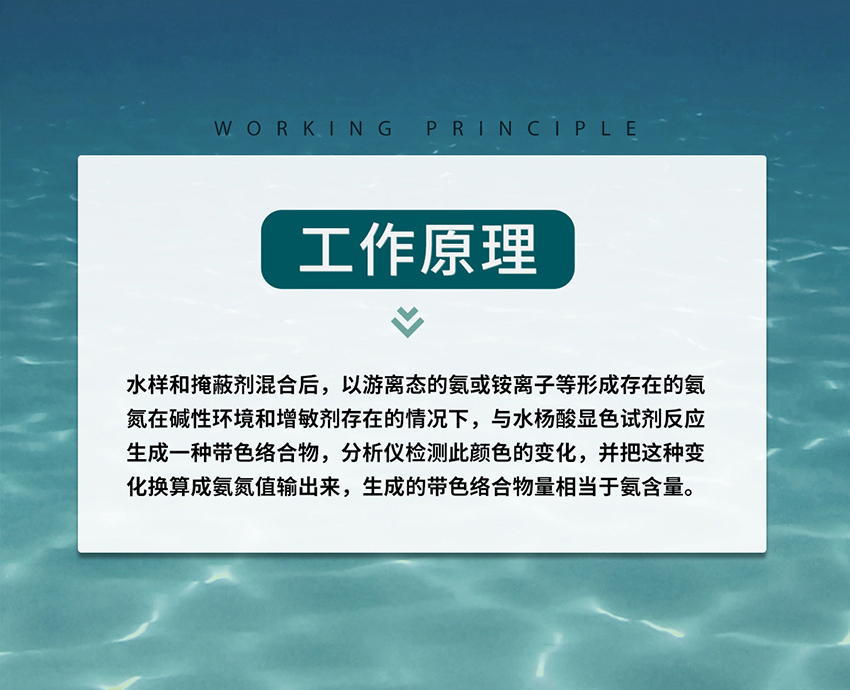 基本原理:水樣和掩蔽劑混合后,以游離態的氨或銨離子等形成存在的氨氮在堿性環境和增敏劑存在的情況下,與水楊酸顯色試劑反應生成一種帶色絡合物,分析儀檢測此顏色的變化,并把這種變化換算成氨氮值輸出來,生成的帶色絡合物量相當于氨含量。