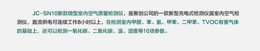 JC-SN10新款微型室內空氣質量檢測儀,是聚創公司的一款新型室內空氣檢測儀,是目前國內較少的一款充電式檢測儀器,其內置大容量鎳氫電池,交、直流兩用供電方式,直流供電可連續工作8小時以上,在檢測室內甲醛、苯、氨、甲苯、二甲苯、TVOC有害氣體的基礎上,還可以檢測一氧化碳、二氧化碳、溫、濕度等10項參數,是目前國內較少的一款十合一產品