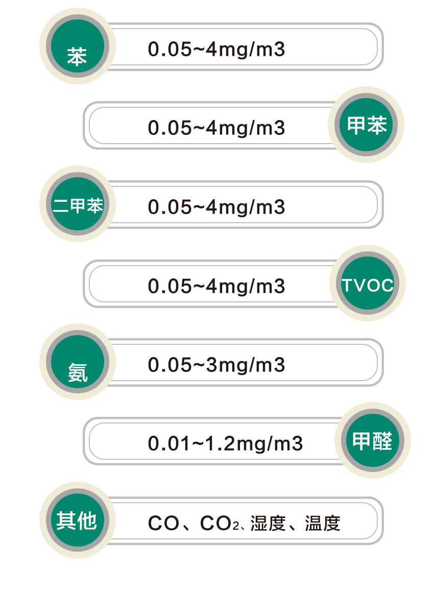 1.測試項目:甲醛、苯、氨、甲苯、二甲苯、TVOC