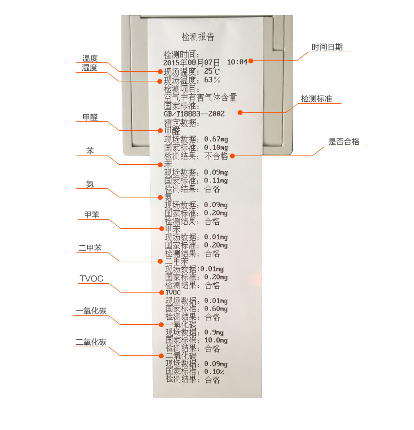 ▲現場測定甲醛含量,并可打印出甲醛、苯、氨、甲苯、二甲苯、TVOC、溫度、濕度、八項檢測結果。