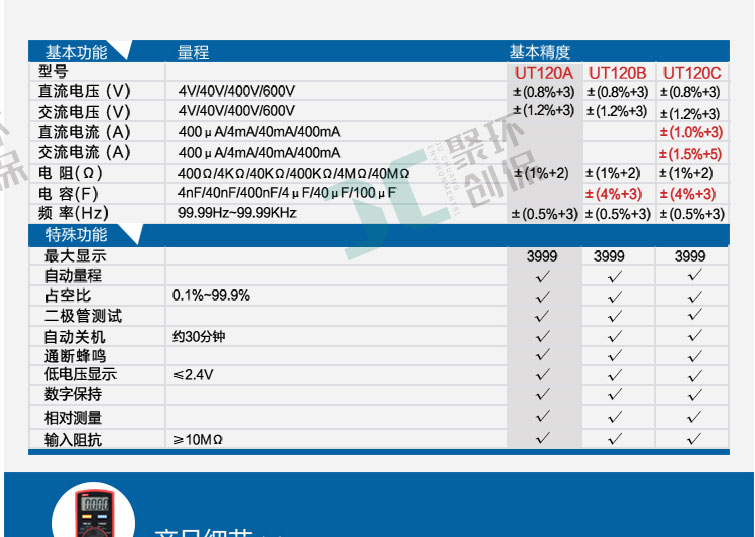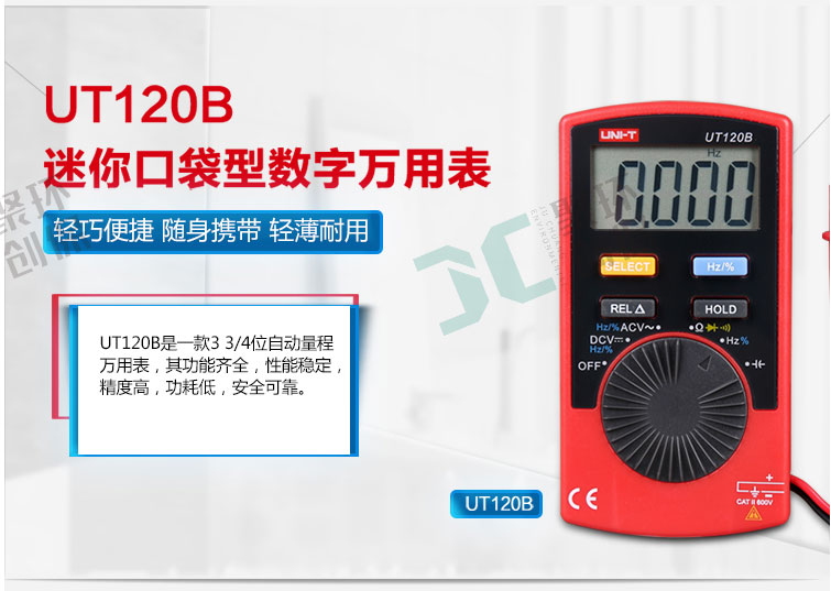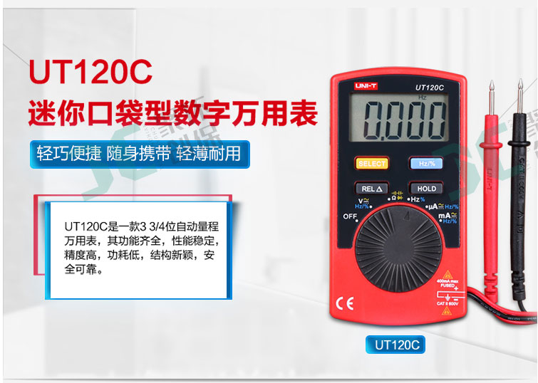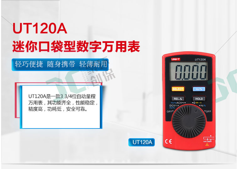 UT120系列是一款可隨身攜帶、小巧、輕便的3 3/4位自動量程口袋型數(shù)字萬用表,其功能齊全,性能穩(wěn)定,精度高,功耗低,結(jié)構(gòu)新穎,安全可靠,操作簡單,好用、耐磨、耐用,是廣大用戶的理想測量儀表。可用于家庭、學(xué)校、冶煉、通訊、制造、石油、電力、化工等領(lǐng)域,是電路/電力設(shè)備維護和維修的理想工具。