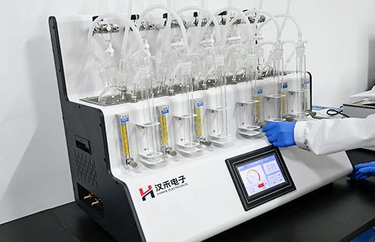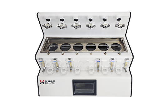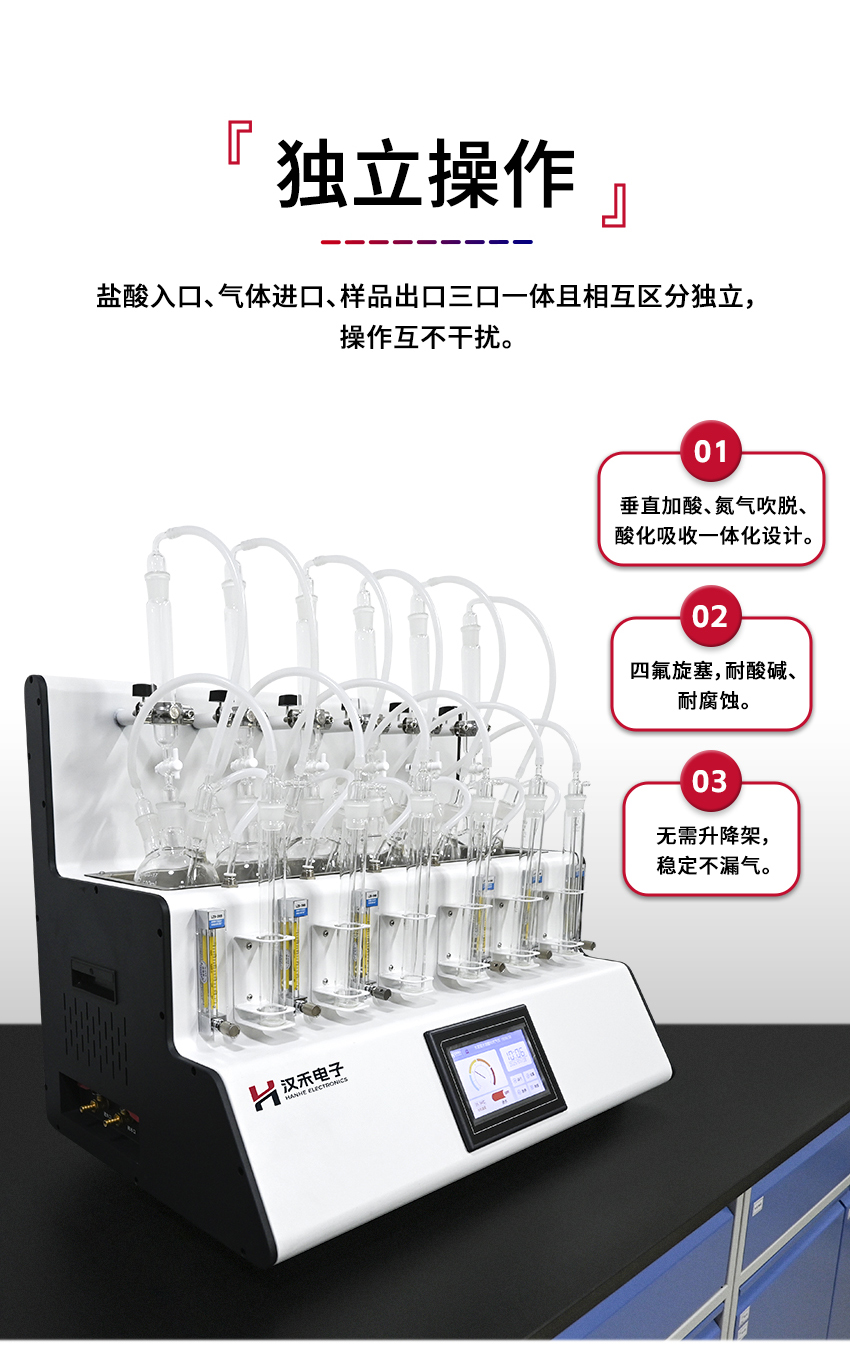 采用垂直加酸、氮氣吹脫、酸化吸收一體化設計。鹽酸入口、氣體進口、樣品出口三口一體但又相互區分,操作過程互不干擾。