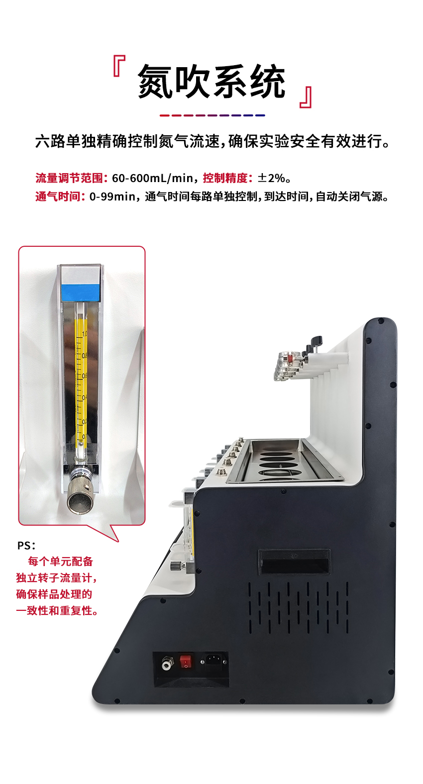 配備4位獨立氮氣控制系統,每個樣品都能獨立開展通氣操作,有效避免樣品之間的交叉污染。同時可精確控制氮氣流速,保障實驗安全、高效地進行。