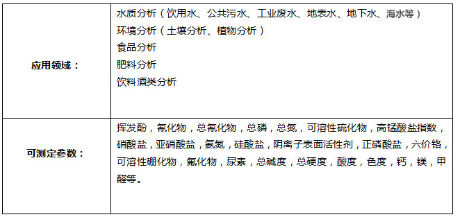 BDFIA-7000多參數流動注射分析系統是基于流動注射技術和在線樣品前處理模塊及紫外可見分光光度法連用的一款儀器。此儀器可用于水質分析、環境分析、食品分析、肥料分析、飲料酒類分析等,可測定揮發酚、氰化物、總氰化物、陰離子表面活性劑、總磷、總氮、氨氮、氟化物、尿素、酸度、硝酸鹽亞硝酸鹽、鈣、鎂、甲醛等檢測項目。