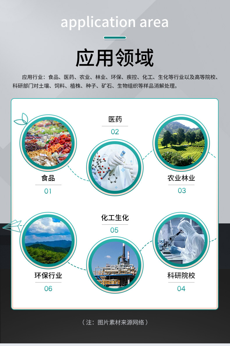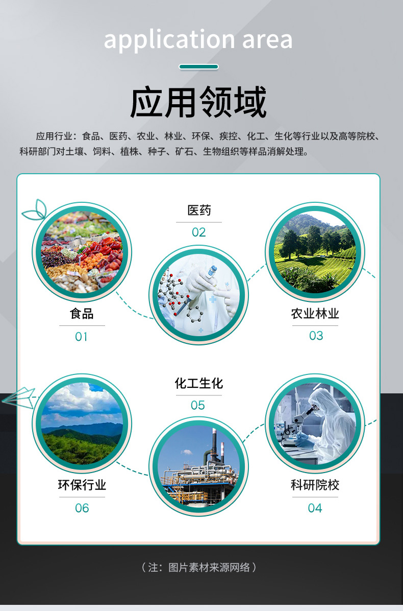 食品、醫藥、農業、林業、環保、疾控、化工、生化等行業以及高等院校、科研部門對土壤、飼料、植株、種子、礦石、生物組織等樣品消解處理。