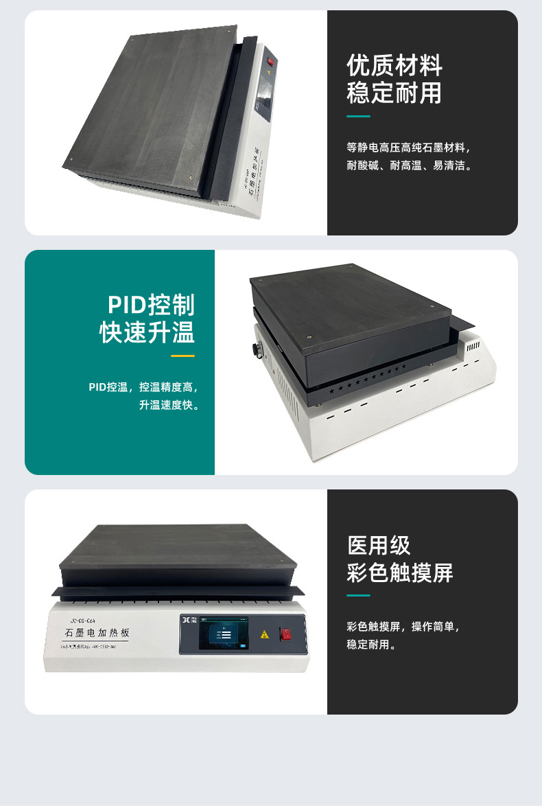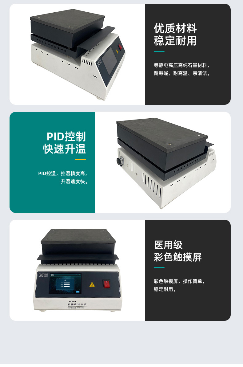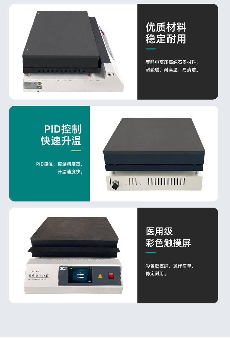 2、加熱板選用導熱性能優越的等靜壓高純石墨,耐酸堿、耐高溫、易清潔,加熱溫度均勻。