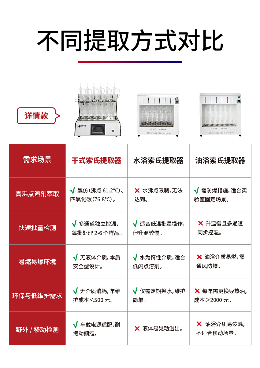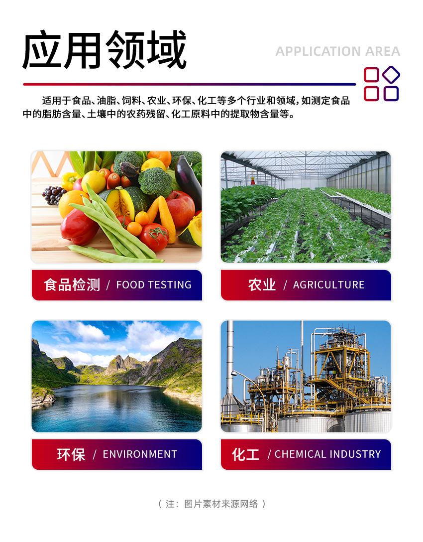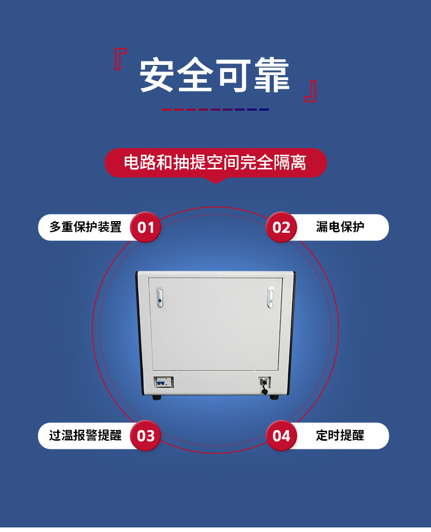 4. 安全可靠:電路與抽提空間完全隔離,配備漏電等多重保護裝置以及完備的時長控制系統。具有過溫報警、定時提醒功能,通過聲音、液晶屏文字提示等多重報警系統向用戶提示,確保儀器能長時間安全穩定運行,保障實驗人員的安全以及實驗的順利進行。
