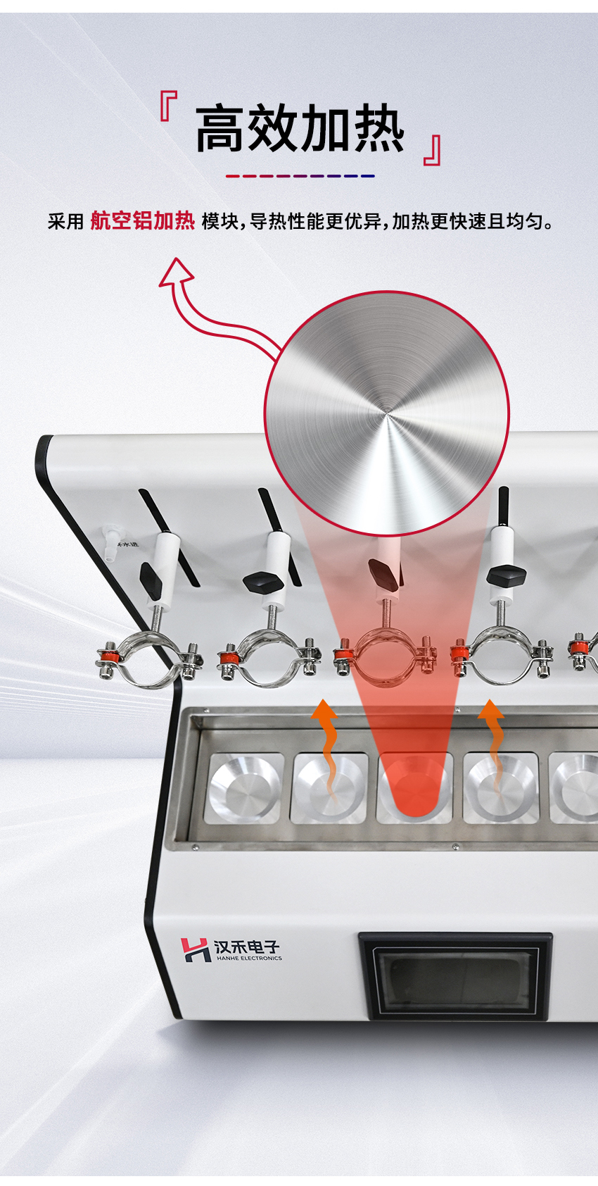 • 1. 高效加熱:采用航空鋁加熱模塊,其導熱性能優異,加熱快速且均勻。能夠迅速使溶劑沸騰形成回流,加快提取速度,大幅縮短提取時間。同時,良好的導熱性能可保證樣品受熱均勻,從而提高實驗結果的準確性。