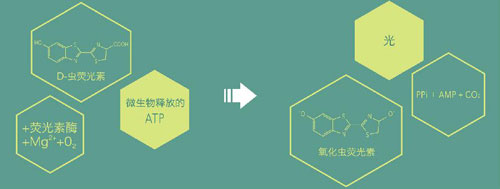 三磷酸腺苷 (Adenosine Triphosphate,ATP)是一切生命體能量的直接來源,普遍存在于動植物細胞、微生物和食物殘留中。ATP熒光檢測法是根據螢火蟲發光原理開發的快速檢測技術。在有氧條件下,蟲熒光素酶可催化蟲熒光素和ATP之間發生氧化反應形成氧化熒光素并發出熒光,發出的熒光強度與微生物數量呈正比例關系。通過測試熒光信號的強度可得知待測目標被微生物污染的程度,因此檢測ATP可作為判斷是否潔凈的直觀指標。